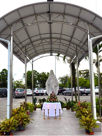 The shrine consists of a larger-than-life-size off-white marble statue of Our Lady with her feet crushing the serpent, her hands extended invitingly and eyes gazing lovingly, standing on a marble pedestal.  The elegant configuration was surrounded by pots of beautiful flowers and greens under a newly constructed shed.
