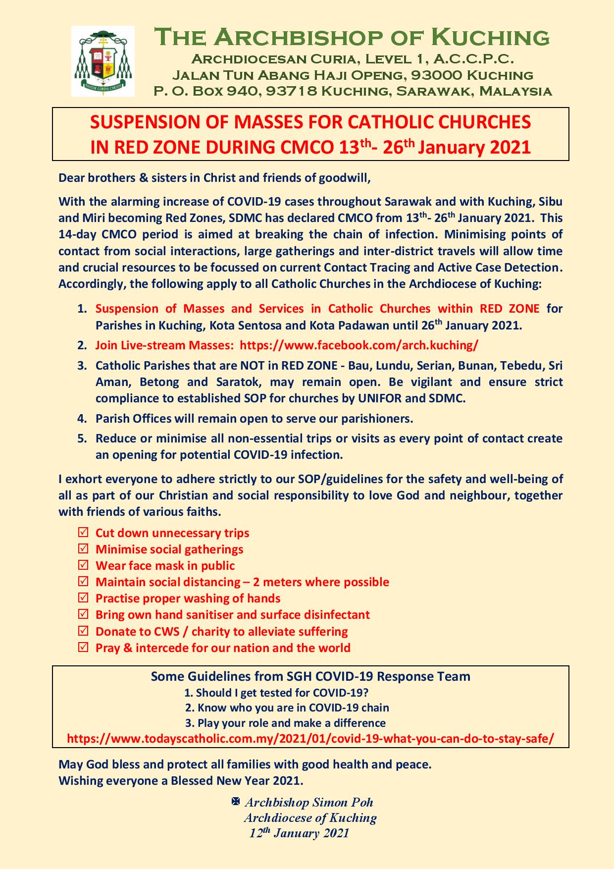 Catholic Churches within the RED ZONE which are affected, cover all Parishes in Kuching, Kota Sentosa and Kota Padawan. This includes the Carpark Mass at St Joseph’s Cathedral.