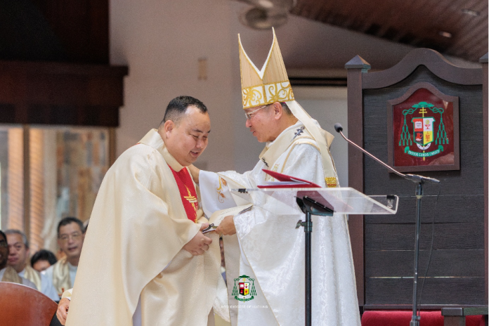 Setelah Penumpangan Tangan dan Doa Pentahbisan, paderi yang baru ditahbis dibantu oleh Fr Adrian Kho untuk memakai stola dan ‘chasuble’ (kasu bela atau jubah kecil).