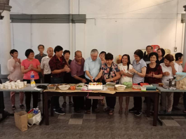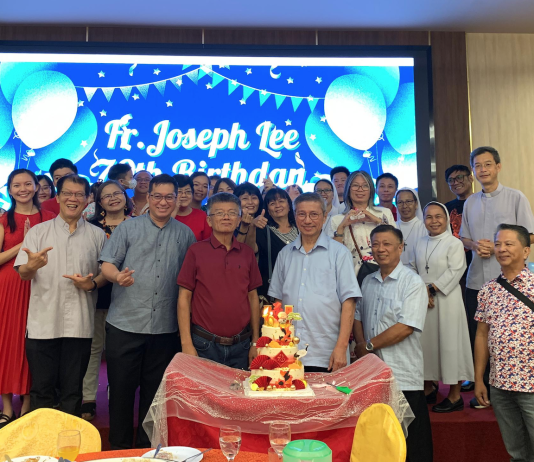 今年 7月31日是傅云生总主教晋铎34周年。古晋总教区总主教公署的员工们于7月29日的员工弥撒后聚集一起,给总主教送上周年蛋糕祝贺他晋铎周年。图为总主教与刘子健神父(总主教后)及众员工。